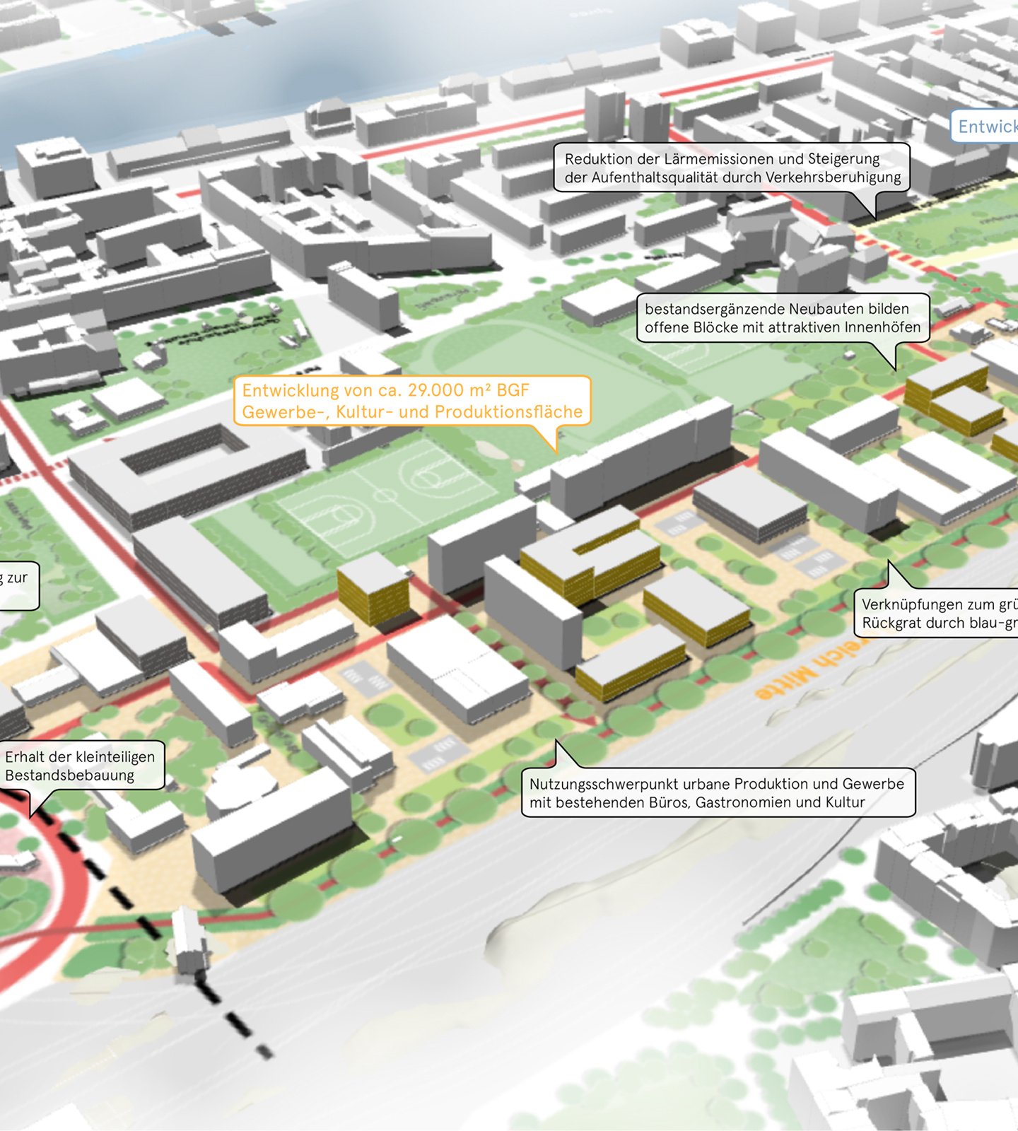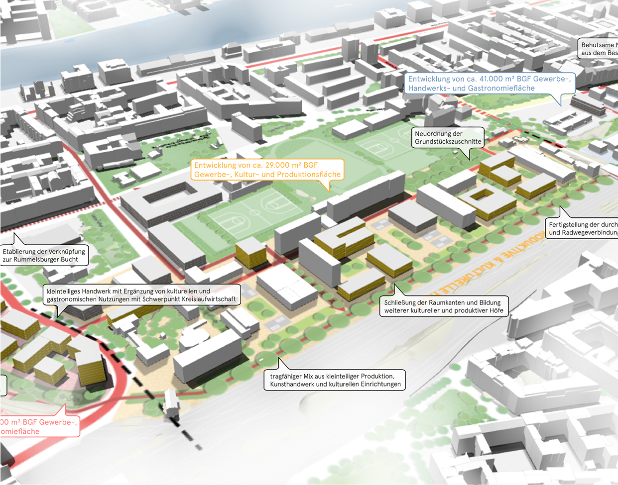 Gemeinsam mit unseren Partnern von bläser jansen partner (bjp) haben wir für das Bezirksamt Friedrichshain-Kreuzberg ein integriertes Entwicklungskonzept für das Untersuchungsgebiet Rudolfband erarbeitet. Ziel war es, in dem Gebiet südlich der Berliner Ringbahn zwischen Warschauer Straße und Ostkreuz Potenziale für Gewerbenutzungen mit höherem Störpotenzial zu identifizieren und geeignete Maßnahmen für die Aktivierung zu definieren. Auf Grundlage vorangegangener Planungen wurden Strategien entwickelt, die die bestehende Mischung aus Wohnen und Gewerbe erhalten, klima- und denkmalgerechte Weiterentwicklungen ermöglichen und innerstädtisches Gewerbe sichern.