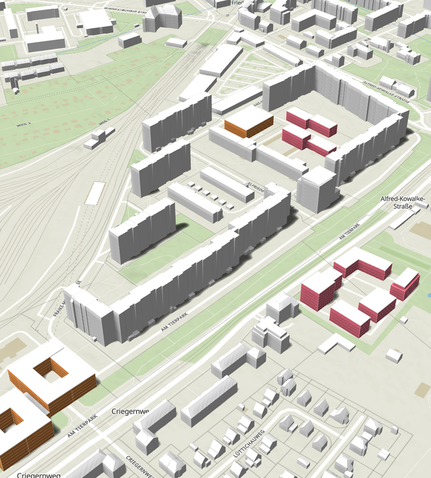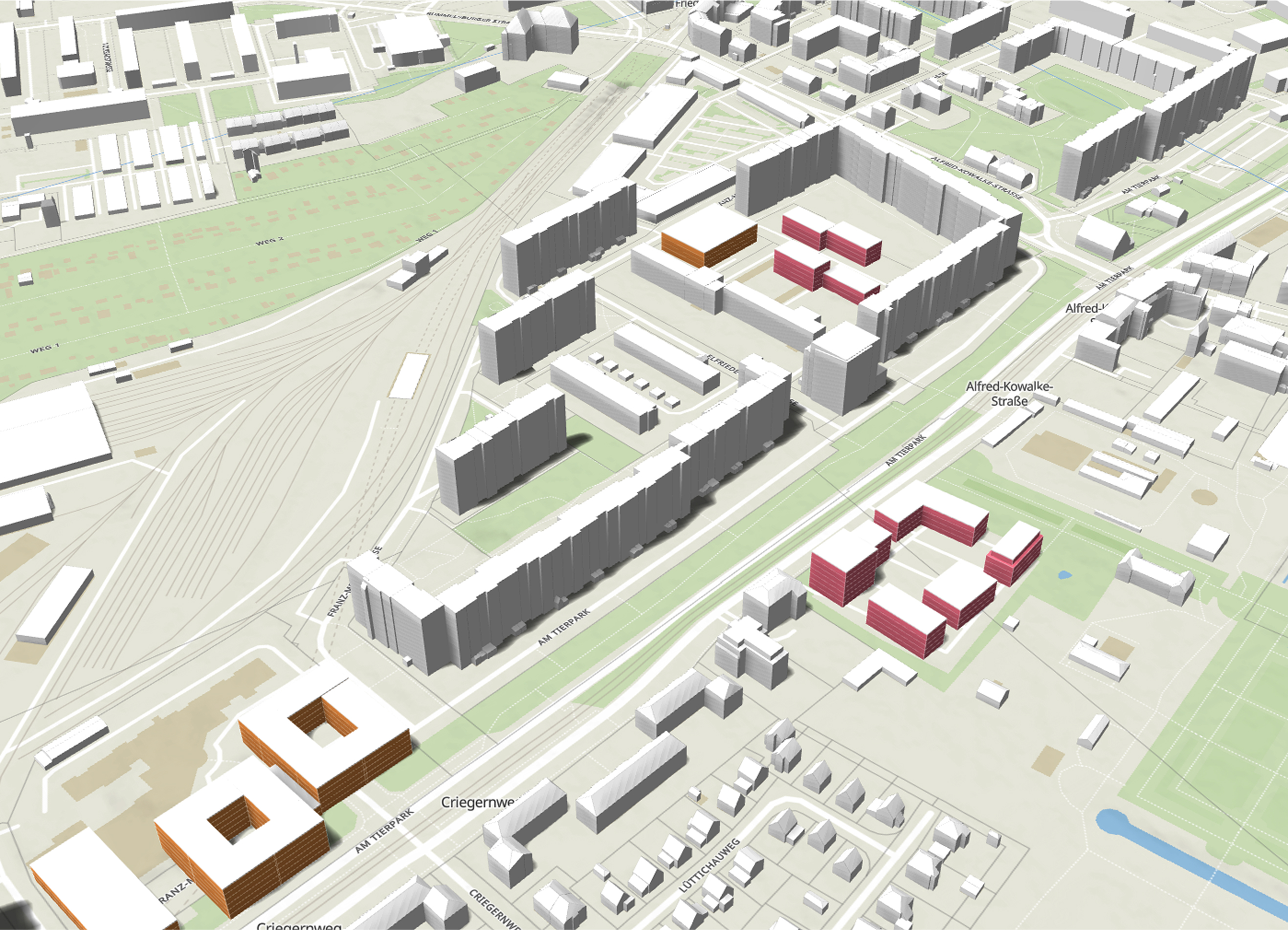 Gemeinsam mit bläser jansen partner (bjp) wurde für den Untersuchungsraum „Am Tierpark“ ein umsetzungsorientiertes Innenentwicklungskonzept erarbeitet. Dabei wurden Flächenpotenziale für verschiedene Wohnformen sowie die Folgebedarfe für soziale Infrastrukturen, gewerbliche Flächen und sonstige Nutzungen ermittelt. Im Sinne einer integrierten Entwicklung wurden die Bedarfe diskutiert und in Entwicklungsvarianten überführt. Durch die Diskussion mit relevanten Stakeholdern konnte eine Fokusvariante erarbeitet werden, welche die vielfältigen Anforderungen in ein räumliches Konzept überführt. Neben den räumlichen Aspekten wurden auch Anforderungen an den Umsetzungsprozess identifiziert und in Form von Handlungsempfehlungen sowie einem Ablaufplan konkretisiert.