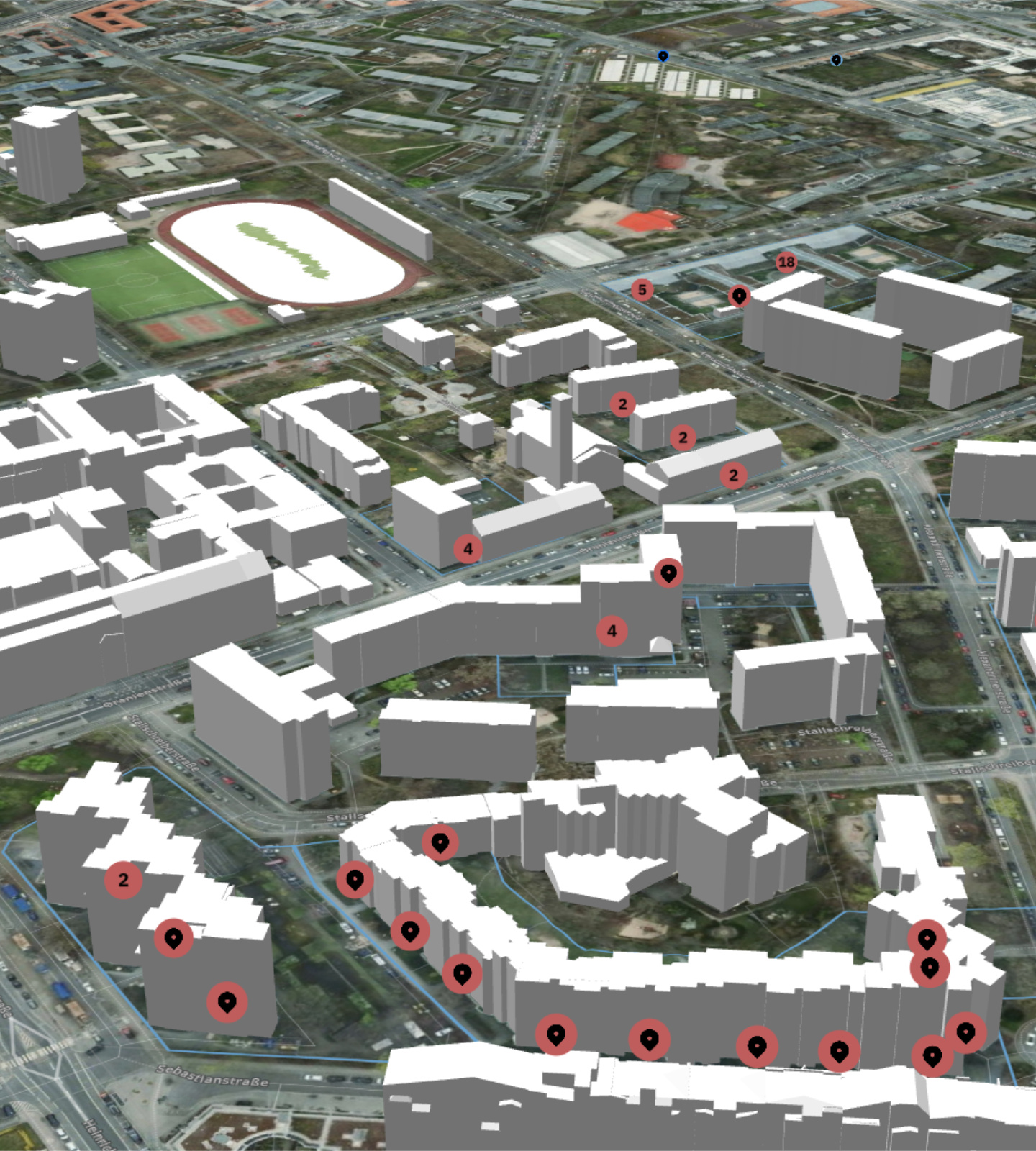 In enger Entwicklungskooperation mit der Wohnungsbaugesellschaft Berlin-Mitte mbH (WBM) wurde eine Bestandsintegration für den umfangreichen Wohnungsbestand konzipiert und umgesetzt. Durch den systematischen Datenbankimport des Wohnungsbestands der WBM, wurden die Datenbankeinträge mit den amtlichen Geodaten im Digitalen Zwilling verknüpft und fortlaufend auf unterschiedlichen Portfolioebenen dargestellt. Durch die Integration ist es möglich, die Bestände in 3D abzurufen, relevante Gebäudedaten auszulesen, wie auch Datenverschnitte in tabellarischer Auswertung anzulegen.